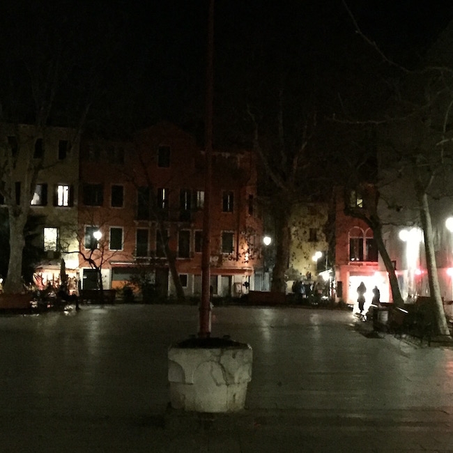 La nuit tombe sur le campo où se sont rassemblés filles et garçons. Ils parlent fort. Gesticulent. Se racontent leur journée. Ils sont enjoués. Elle tient son chien en laisse de la main gauche, un verre et une cigarette américaine dans la droite. Elle prend part à la conversation en cherchant son équilibre, tangue, parvient difficilement à maîtriser l’animal. Elle s’est écartée du groupe et contemple maintenant le va-et-vient des vaporetti sur le Grand Canal. La circulation est dense à cette heure. Elle rêve d’heures lointaines. La ville s’éloigne dans un manteau de brouillard. Son chien veille. La nuit tombe. On devine les contours d’un puits au centre de l’image. A l’arrière-plan deux silhouettes se rapprochent ou s’éloignent.