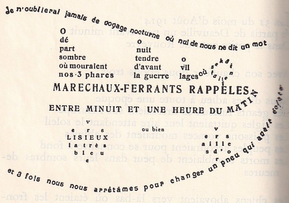 Le poète se voit comme avalé par les événements : « Je m’en allais portant en moi toutes ces armées qui se battaient / Je les sentais monter en moi et s’étaler les contrées où elles serpentaient ». Nul n’échappe à la marche infernale du monde. Apollinaire y prendra toute sa part. Le poème se poursuit. Il est illustré d’une strophe en calligramme qui figure la tête d’un chien : « Je n’oublierai jamais le voyage nocturne où nul de nous ne dit un mot »…