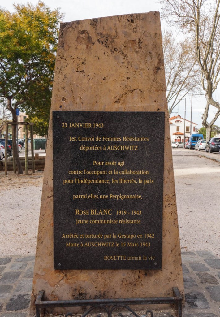 Ce matin, à l’appel de l’Association des Amis de la Fondation de la Mémoire de la Déportation et de Femmes Solidaires 66, hommage est rendu à la résistante Rose Blanc, assassinée à Auschwitz le 15 mars 1943. La cérémonie a lieu à l’angle des boulevards Anatole France et Frédéric Mistral où se dresse une stèle à sa mémoire, non loin d’une avenue de la ville portant son nom. Ses amis l’appelaient Rosette.