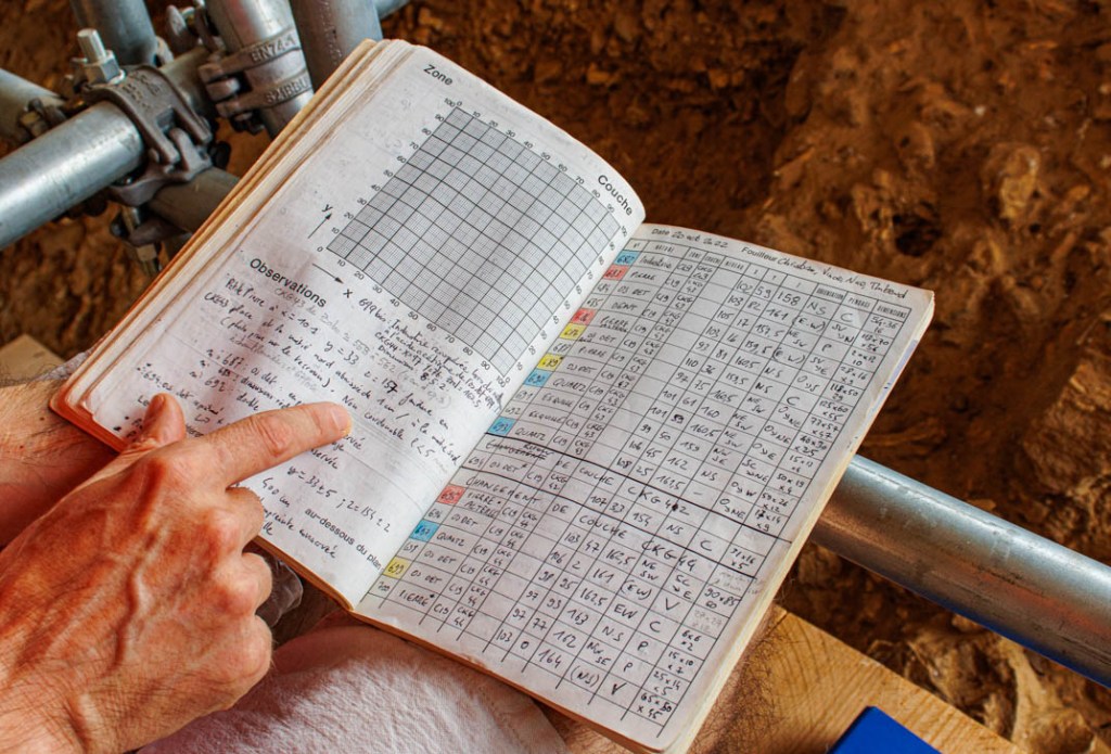 Ils ont l’art de lire la terre comme un grand livre ouvert sous leurs yeux. Ils doivent tout voir. Passer au tamis chaque millimètre du carré qui leur a été confié. Depuis 1964, des archéologues professionnels et bénévoles se succèdent à la caune de l’Arago à Tautavel où des traces d’occupation humaine avaient été détectés bien avant la découverte, en 1971, du crâne Arago 21 qui fait aujourd’hui la célébrité du lieu. Notre ancêtre, homo heidelbergensis, vivait ici il y a 450 000 ans. C’était un nomade chasseur-cueilleur qui se débattait contre les affres du climat et la sauvagerie des bêtes qui l’entouraient. Grâce aux découvertes des chercheurs, nous le connaissons mieux aujourd’hui. Nous pouvons le suivre dans son quotidien. L’imaginer allant, venant, dans cette plaine baignée par les eaux du Verdouble et la lumière de Méditerranée mais qui, à cette époque lointaine, était recouverte de steppes. Les archéologues ne sont toutefois pas « que » des imaginatifs. Avant d’écouter une intuition murmurer à leur oreille quelque piste de recherche, ils travaillent méthodiquement, avec une rigueur qui ne tolère aucune émotion. Quand un archéologue découvre un reste, qu’il soit humain ou animal, il ne pleure pas. Il ne se laisse pas submerger par la joie immense qui l’envahit. Dans son carnet, il note l’emplacement exact de sa trouvaille, son orientation, il la dessine sur du papier millimétré pour que les générations futures sachent où, quand, comment, ce petit morceau de squelette a été trouvé. Parce que les archéologues vivent un drame dont ils ne parlent pas : ils détruisent l’archive sur laquelle ils travaillent. Un chantier de fouille, ce n’est pas comme un livre dont la page demeure une fois qu’on l’a lue et tournée. La feuille de l’archéologue, c’est le carré de terre qu’il creuse et qui disparaît une fois qu’il l’a exploré. Un jour, plus personne ne fouillera la caune de l’Arago parce que tout aura disparu. Mais le grand livre, lui, pourra toujours être consulté : ce sont les modélisations établies à partir des carnets de notes des fouilleurs, et ce sont les réserves du laboratoire de recherche associé au musée de Tautavel. Elles sont riches aujourd’hui de quelque 400 000 objets retrouvés là-haut, dans la caune, tout au bout d’un chemin escarpé qui, pour le dire avec le poète occitan Claude Marti, a garrigue sur ciel.