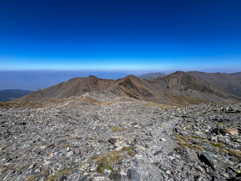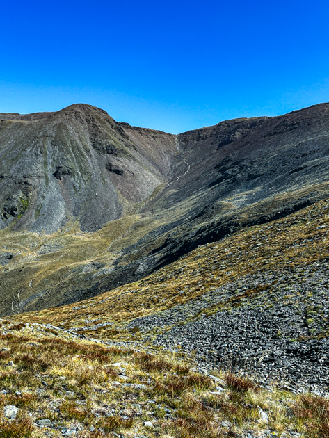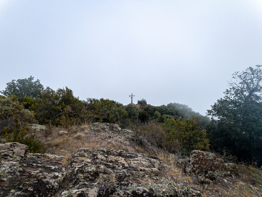 Le sentier que l’on devine sur cette photographie conduit au col de Nuria. En suivant la crête, on peut atteindre le sommet du pic d’Eina (Eyne) qui culmine à 2789 mètres. La pente, nous préviennent des randonneurs qui en redescendent, est très raide. Là où nous nous trouvons, nous sommes déjà éprouvés par une marche de plusieurs kilomètres sur des terrains accidentés et nous aurions seulement accompli à ce stade la partie la plus aisée de la randonnée. Comme nous ne souhaitons pas jeter toutes nos forces dans cette bataille car nous avons l’intention, dès le lendemain, de gravir les pentes du Puigmal d’Err (2910 m), nous préférons renoncer.