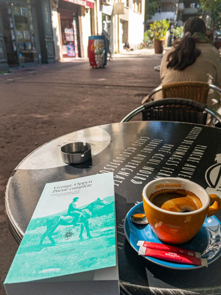 Un café allongé sur la place des Beaux-Arts de Montpellier en compagnie de George Oppen dont je découvre l’œuvre poétique dans la traduction d’Yves Di Manno qui vient d’être rééditée chez Corti.