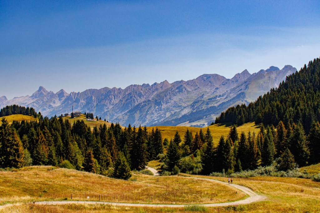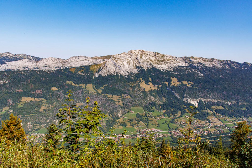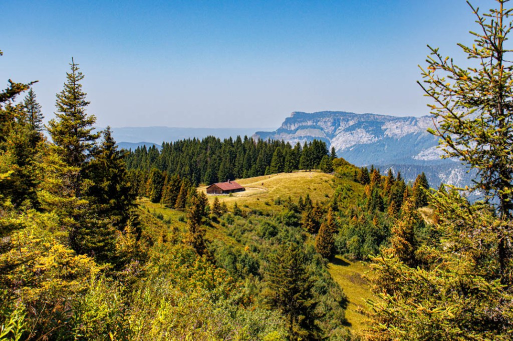 La majeure partie de la balade s’effectue à l’ombre d’une forêt généreuse et accueillante. Elle n’est pas spectaculaire sur le plan visuel et photographique. Peu de vues panoramiques époustouflantes comme la veille, sinon devant nous l’étendue ocre et verte du plateau de Beauregard avec, en toile de fond, la chaîne des Aravis. De Colomban, on voit le Mont-Blanc mais la lumière n’est décidément pas favorable. Trop crue. Trop violente. Impossible de photographier. Déjeuner sous des ombrages à Colomban. Au menu : salade avocats, champignons, œufs durs.