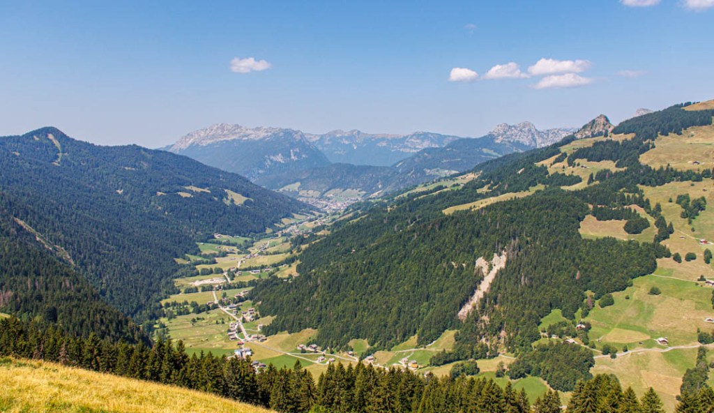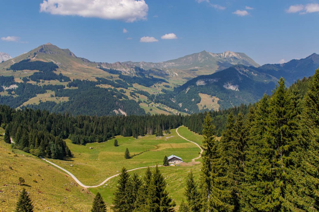 Arrivés au refuge, nous faisons quelques pas en direction du Planet par le GR de pays du Massif de Tournette-Aravis. Nous rebroussons chemin et puisque nous avons du temps devant nous (il est à peine midi quand nous atteignons Bombardellaz), nous décidons de monter jusqu’au chalet de Tardevant. La pente est raide mais la vue est superbe. Sur notre droite, la vallée du Grand Bornand, le Mont Lachat de Châtillon, à ne pas confondre avec le Mont Lachat au-dessus de Thônes. Nous déjeunons Sous Tardevant (1765 m), au pied du chalet que nous atteindrons avant la redescente. Au menu : sandwich jambon blanc, beurre fermier et compote de pommes. Nous effectuons le retour par la piste puis le sentier qui conduit jusqu’au chalet de Paccaly (1490 m) et le hameau des Confins. Nous avons marché sous les ombrages protecteurs des forêts puis bénéficié d’une brise rafraîchissante dans les parties ensoleillées. Nous n’avons pas souffert de la chaleur malgré la canicule annoncée et bien réelle dans les vallées.