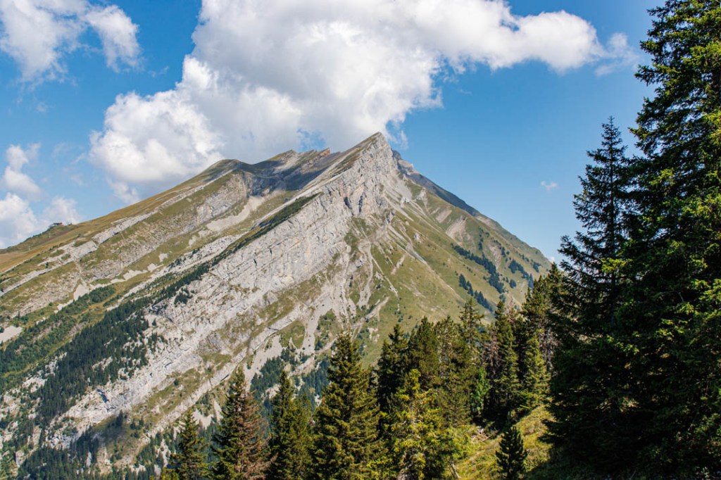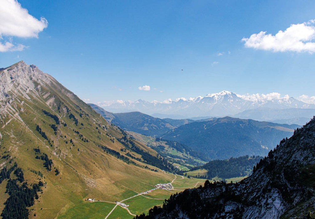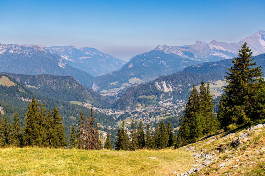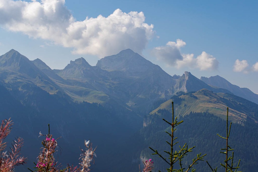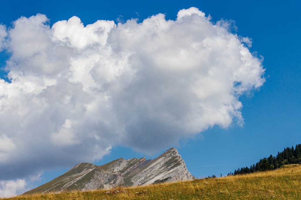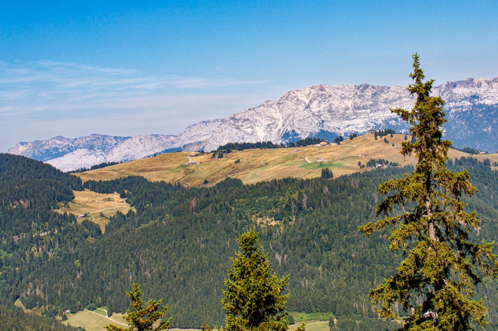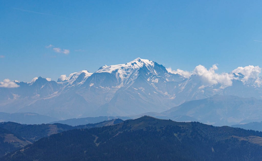 La météo change à partir de demain. Pluie et averses orageuses annoncées jusqu’à vendredi, jour de notre départ. La randonnée d’aujourd’hui est donc la dernière. Il fallait terminer en beauté ! L’ascension vers le Belvédère du Merdassier se mérite. Elle est longue (6,51 km) et offre des portions très pentues. Mais la température est convenable et nous pouvons sans difficulté marcher à découvert. La fraîcheur de la brise d’altitude atténue les effets des rayons d’un soleil généreux. Nous prenons très vite de la hauteur. Face à nous, la pointe de Beauregard (1644 m) et son plateau environnant que nous dominons bientôt. Mais celle qui nous montre le chemin est l’Aiguille de Borderan (2492 m) que nous ne quittons pas des yeux. Elle nous accompagne de sa puissance. On imagine à sa vue quelle force herculéenne s’est déployée au moment du basculement de cette montagne. C’est là affaire de géants ! La vedette, une fois arrivés au Belvédère, sera bien sûr le Mont-Blanc qui règne encore ici en maître et que désigne l’Aiguille dont nous venons de parler. Aujourd’hui, on repère facilement à la droite du Père l’Aiguille Verte, l’Aiguille du Midi et les Grandes Jorasses. Spectaculaire ! Nous prenons la photo d’une famille qui voit le Mont-Blanc « d’aussi près » pour la première fois. Une autre d’une toute jeune adolescente qui, en compagnie de sa grand-mère et de sa sœur, n’était jamais montée aussi haut. C’était pour elle une sorte de baptême. Une journée qu’elle n’oubliera pas. C’est fou ce que la montagne émerveille ! Et beau à voir, des gens heureux. Nous déjeunons juste en dessous du Belvédère, adossés au chalet d’arrivée du télésiège. Au menu : salade de coquillettes, avocat, champignons et thon. Compote. Café. Prêts pour l’ultime descente. Si nous avons préféré une sente lors de la montée, nous choisissons cette fois de suivre la piste qui n’offre pas un parcours beaucoup plus facile en raison d’un sol caillouteux instable. Arrivée aux Etages. Il reste une ultime demi-heure de marche tranquille dans un sous-bois et nous serons de retour au col de la Croix Fry où nous attendent glace et limonade à la terrasse des Rosières, le café-hôtel-restaurant du col.