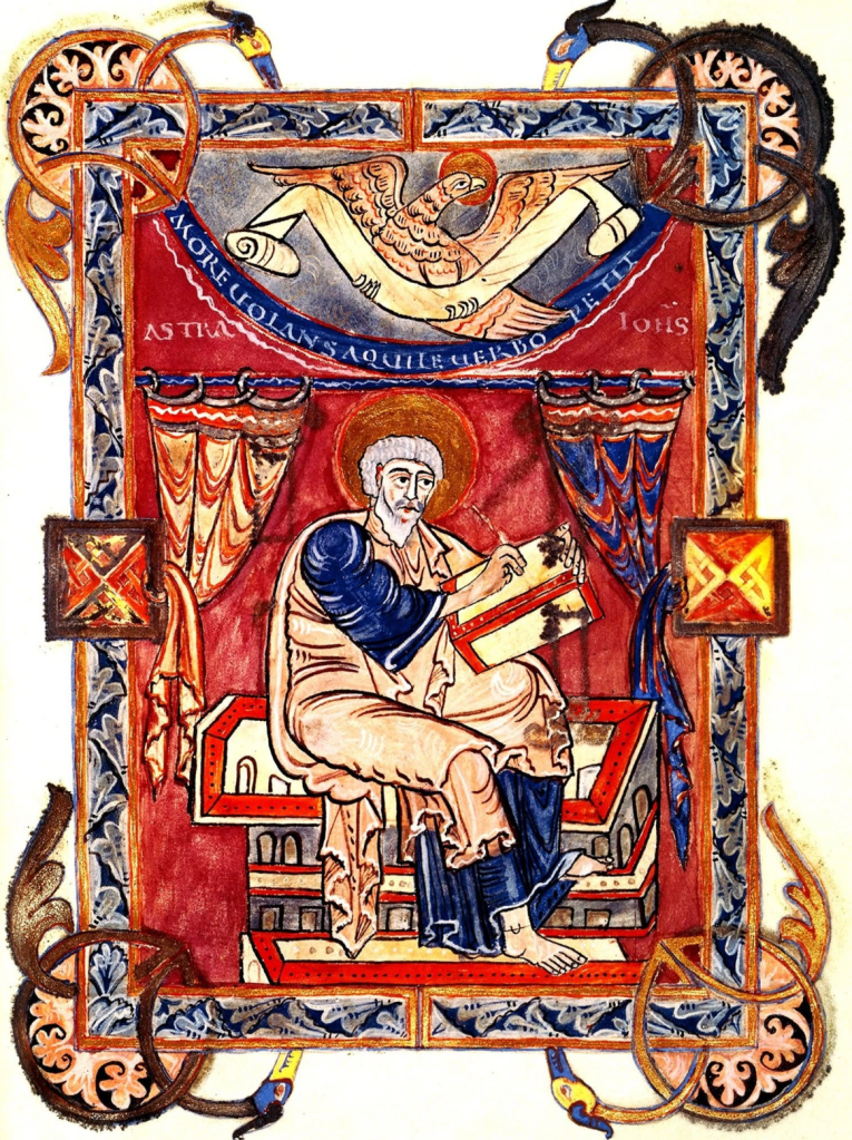 « More volans aquile verbo petit » (Tel un aigle en vol, il cherche par la Parole). Cet après-midi, longue contemplation de cette enluminure représentant Saint Jean l’évangéliste écrivant et méditant.