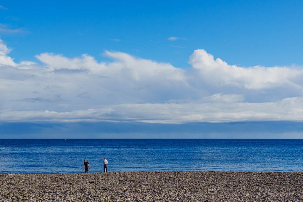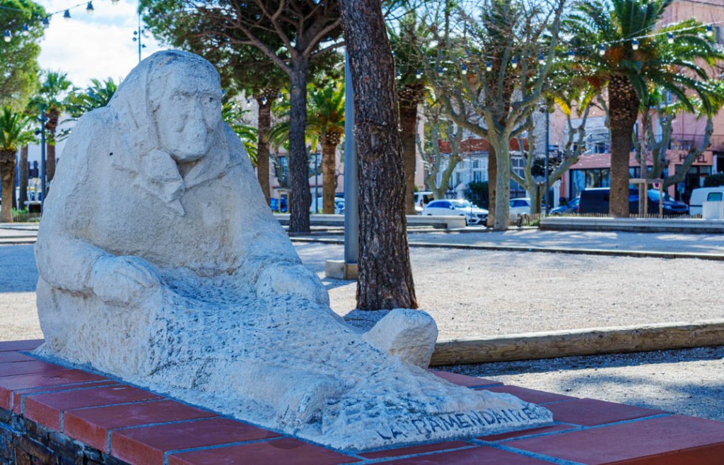 J’ai réalisé la suite photographique ci-dessous entre 10 h 25 et 11 h 22, le long du front de mer de Banyuls-sur-Mer où nous sommes venus ce dimanche comme on ouvre une parenthèse. Peu de monde à cette heure. Quelques passants. Couples avec enfants se dirigeant vers l’espace ludique. Non loin, « La Ramendaïre » du sculpteur Manolo Valiente. La statue représente une « remailleuse » raccommodant les mailles d’un filet de pêche. Ce travail était autrefois réservé aux femmes. J’essaie de lire dans son regard. Je n’y vois que silence comme si la vie dont elle est un emblème abîmé s’était éteinte à tout jamais. En terrasse, les buveurs de café froissent les nouvelles du jour dans leurs mains agacées. Sur un banc public, deux hommes scrutent l’horizon. De quoi parlent-ils ? Je suis trop éloigné d’eux pour entendre. Je ne m’approche pas. Je préfère m’avancer sur la grève et prêter l’oreille au roulis des vagues dans les cailloux. A ce jeu perpétuel, c’est toujours la mer qui l’emporte. Fin de la parenthèse.