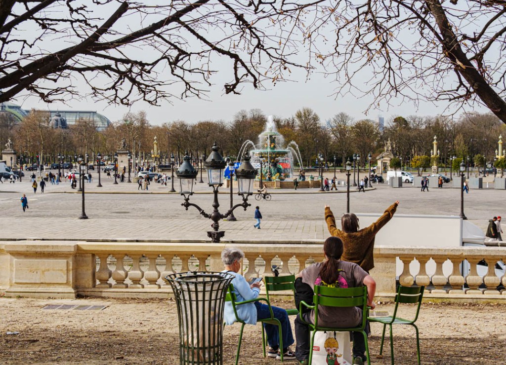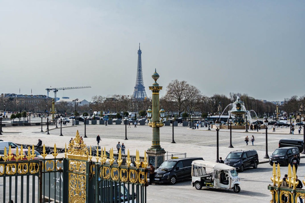 Ce jour-là, je m’étais rendu au musée du Jeu de Paume pour visiter l’exposition du photographe Martin Parr. Comme j’étais arrivé très en avance au regard de l’horaire de ma réservation, j’en ai profité pour déambuler dans le Jardin des Tuileries. Me dirigeant vers un balcon dominant la place de la Concorde, une question m’a saisi : allais-je répéter le même geste et photographier une fois encore l’obélisque ? quand c’est une tout autre image qui m’a saisi. Je me suis retrouvé face à un enchevêtrement de formes qui, fixées en un même instantané, révélaient un paysage que le monument égyptien, de par sa prestance et sa célébrité, eût occulté à son seul profit. La présence de la non moins imposante et célèbre Tour Eiffel au second plan de la photographie, loin de nuire à l’ensemble, me semble participer pleinement de ce concert de ferrailles, de dorures, de béton et de macadam. Une symphonie urbaine.