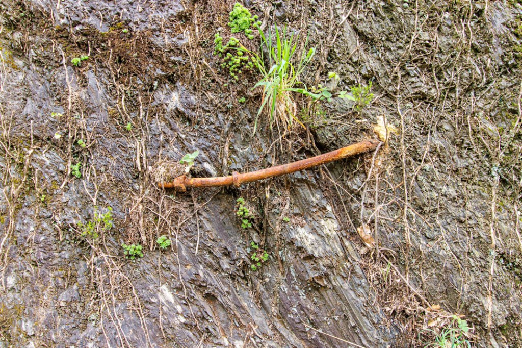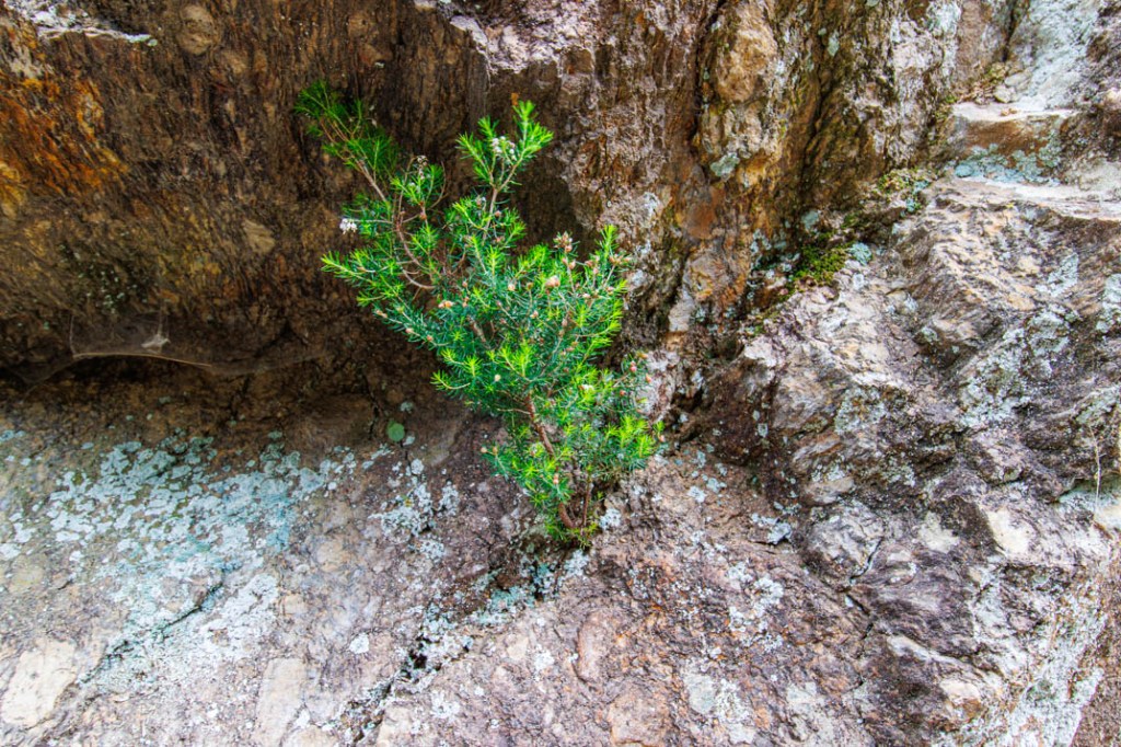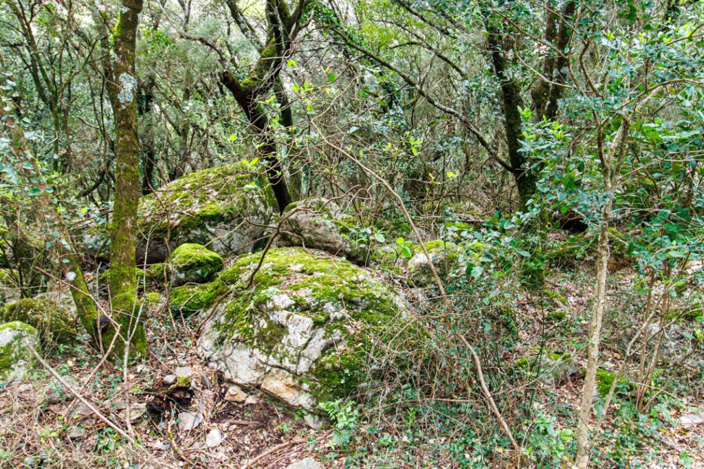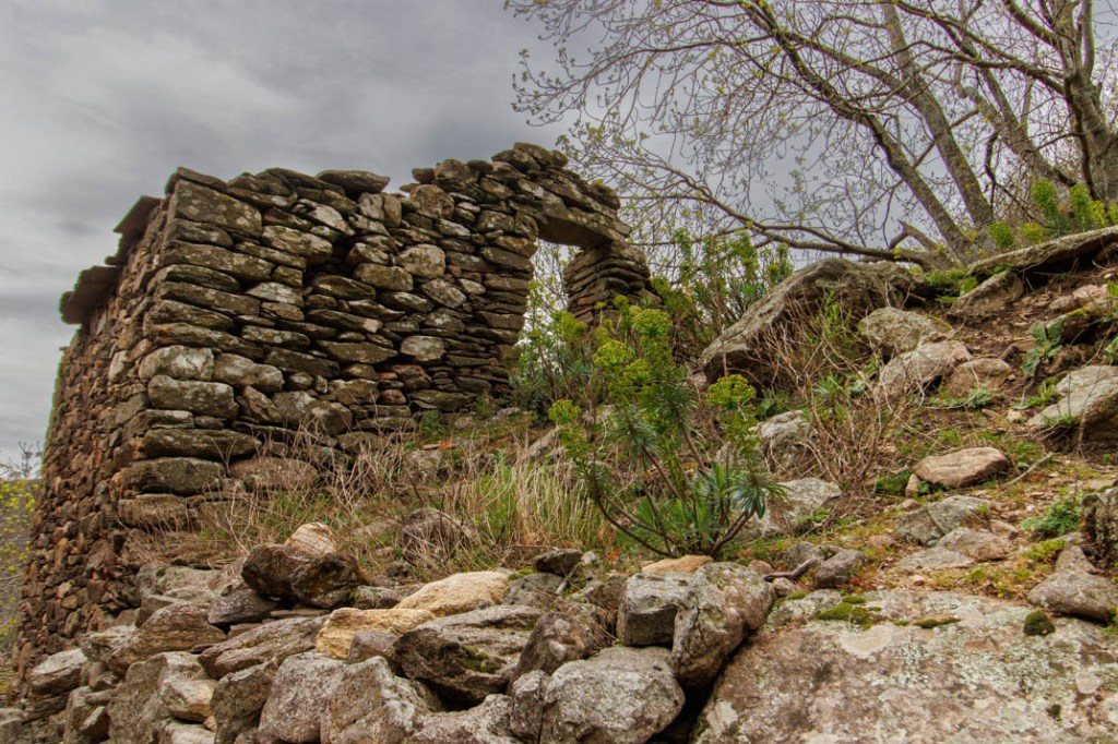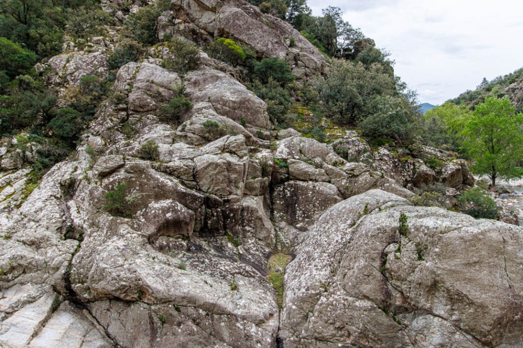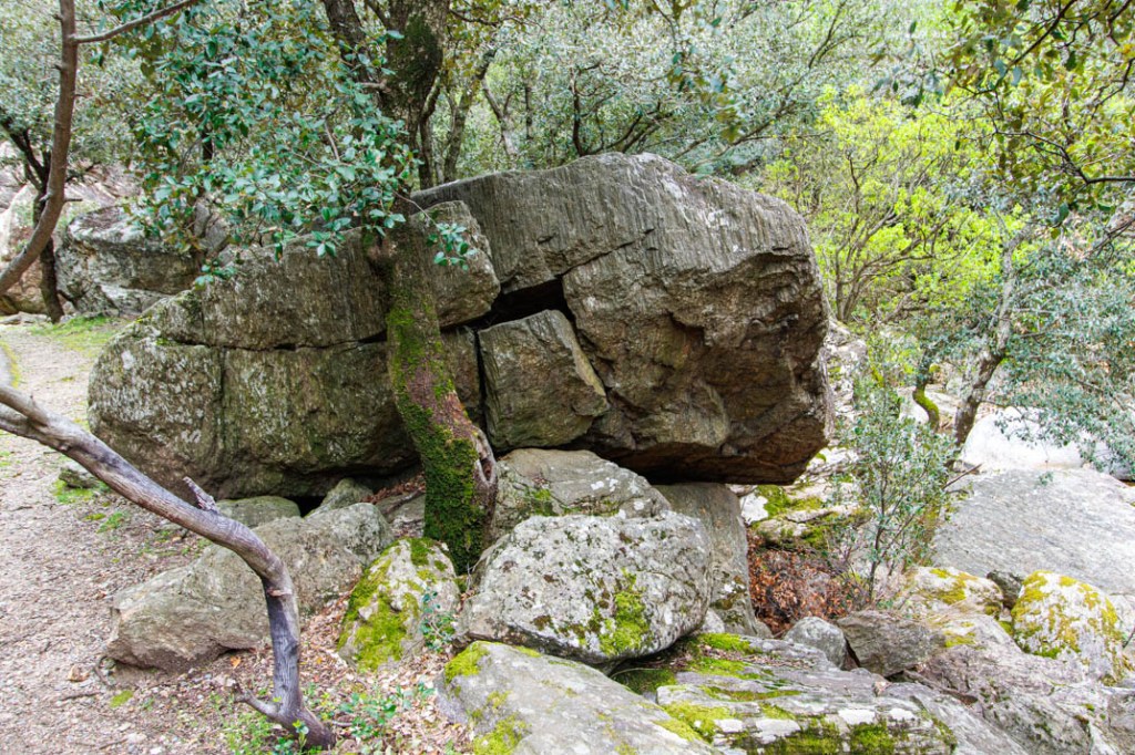 Nous marcherons jusqu’au hameau d’Héric en suivant le cours d’eau. Le sentier rejoint le GR7 qui se confond ici avec le GR de Pays « Tour de la montagne du Haut-Languedoc ». Le parcours ne présentant aucune difficulté, l’ambiance est familiale. Nous croisons des promeneurs. Malgré le vent qui souffle en rafales, deux grimpeurs s’agrippent à une paroi. La végétation, de même, compose avec la pierre. Chacun, ici, cherche à nourrir son âme jusque dans la césure.