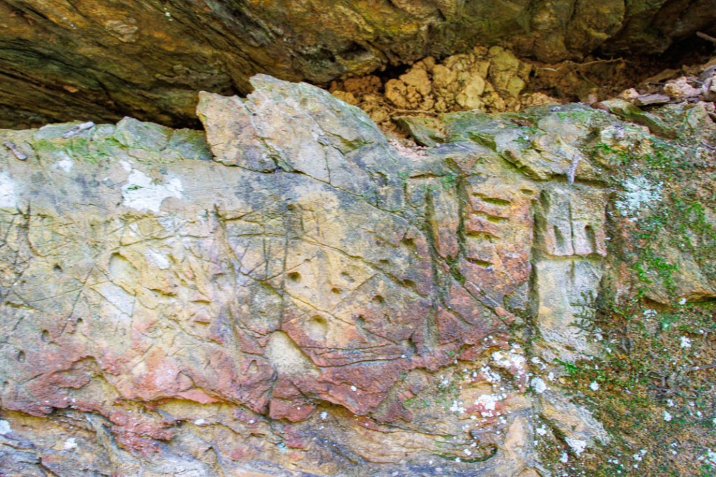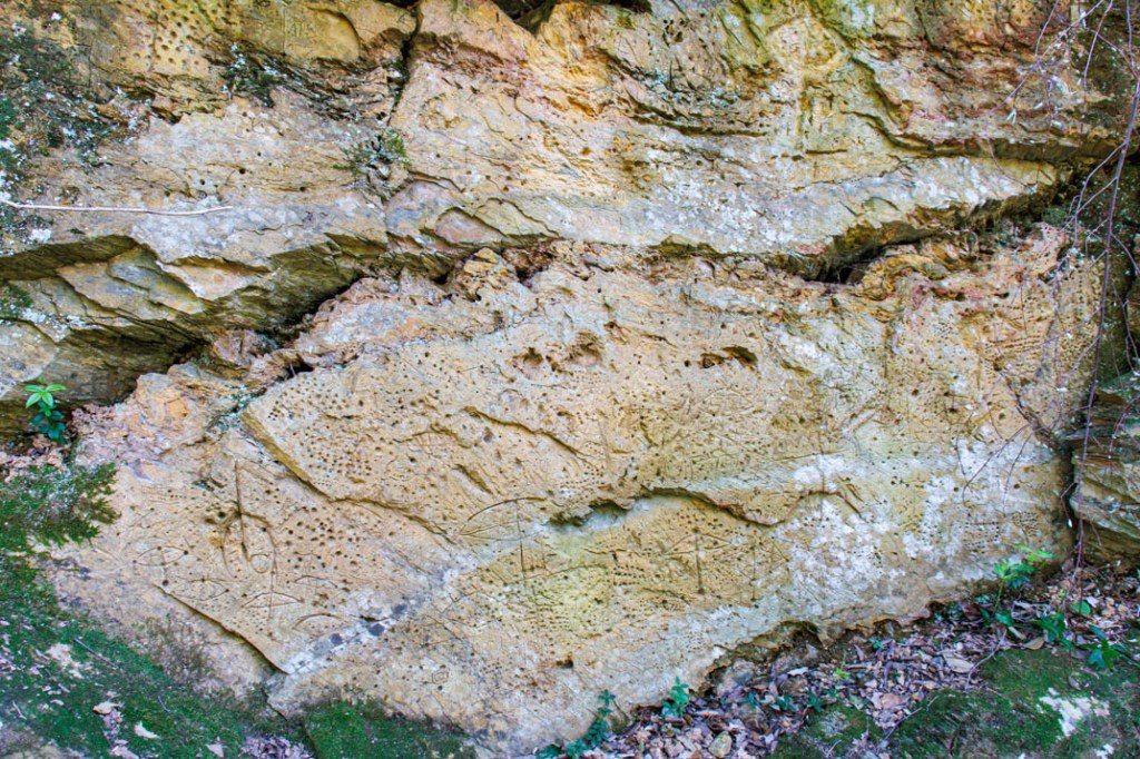 C’est quelque part, sur ce chemin, à proximité du lieu-dit Les Laisses, que se trouve la Peiro Escrito, classée monument historique par arrêtés du 11 octobre 1965 puis du 4 novembre 1971. Les graffiti ont probablement été réalisés par des bergers de l’âge du bronze.