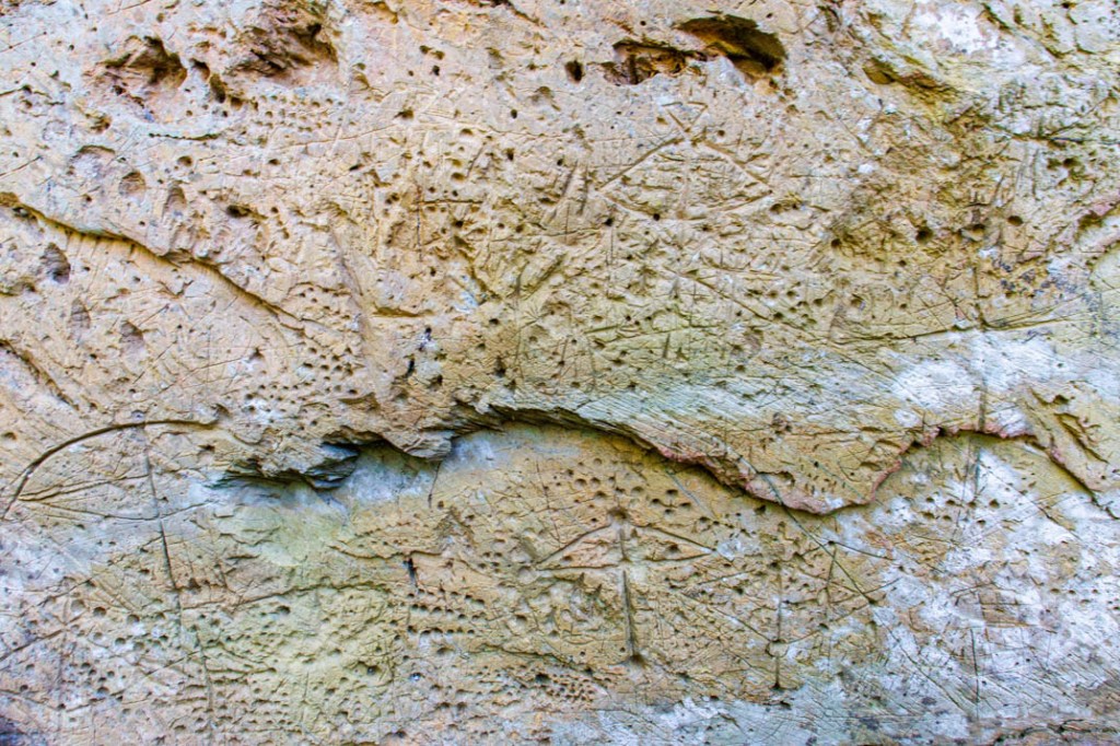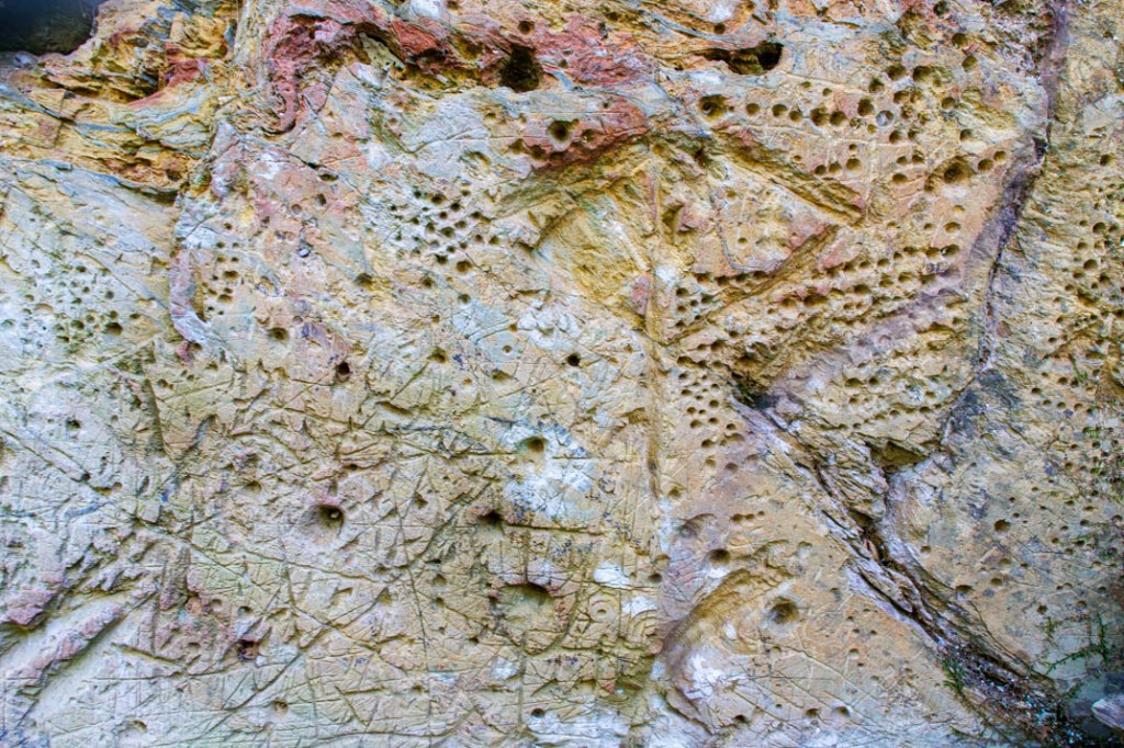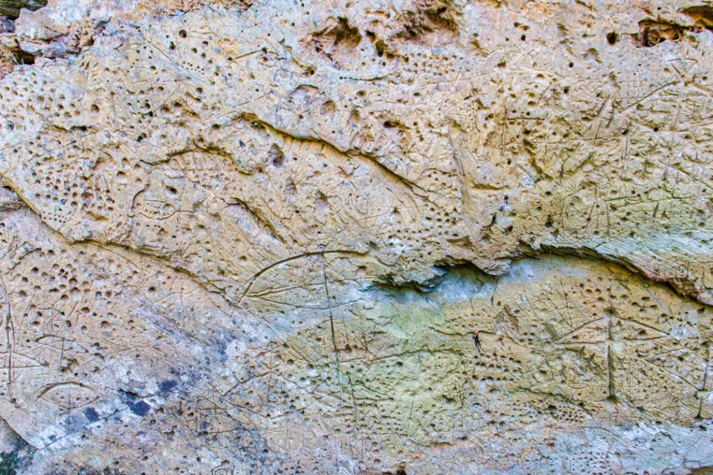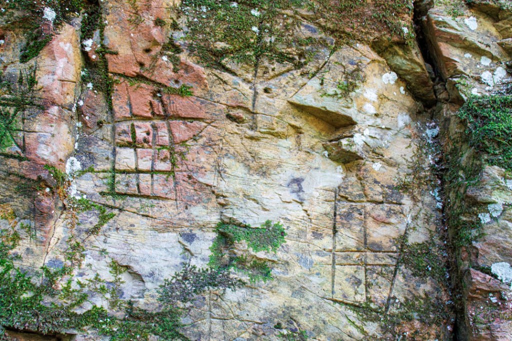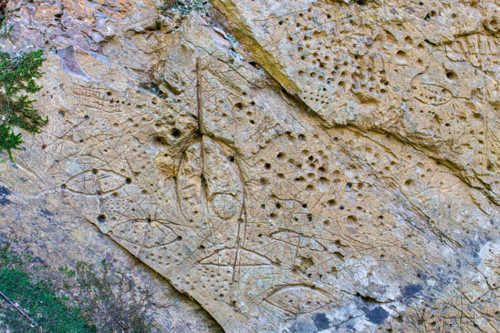 Que nous disent ces pétroglyphes ? On devine ici peut-être la représentation d’une arbalète. Là, une croix. Mais je ne suis pas archéologue et la plupart de ces symboles me demeurent énigmatiques. De même ces innombrables trous pratiqués dans la roche comme des signes de ponctuation. Je voudrais à mon tour que mon corps tout entier soit traversé de signes mais je suis démuni devant ce langage et me complais dans ce dénuement qui me ramène au fond des âges. Depuis quand n’ai-je plus ingurgité de terre ?